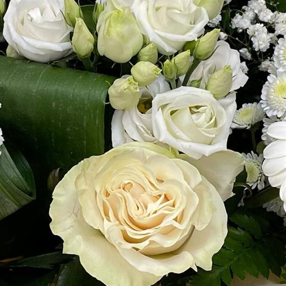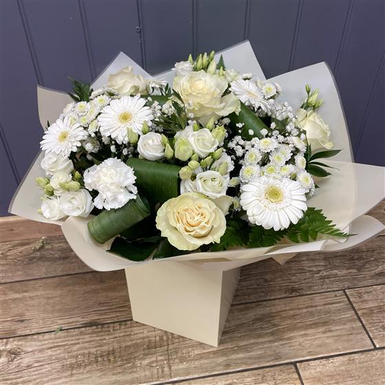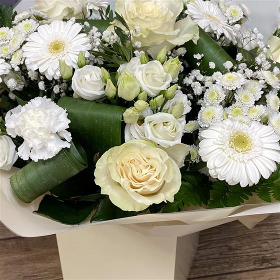 A timeless hand tied arrangement of classic white flowers, hand tied in water presented in a gift box
