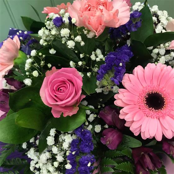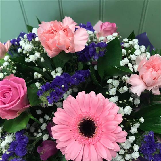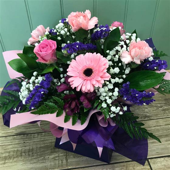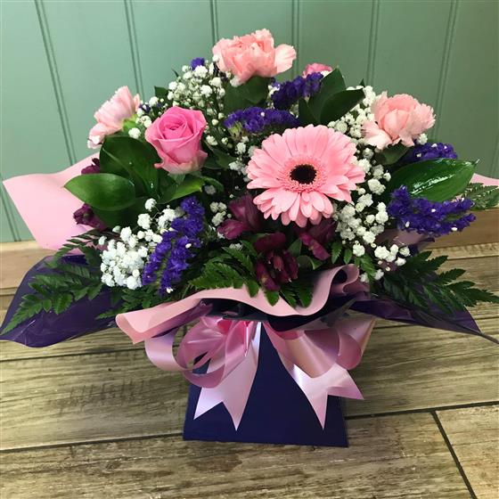 A selection of pink, purple & white seasonal flowers arranged in oasis and presented in a gift box as the container.