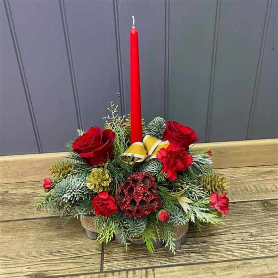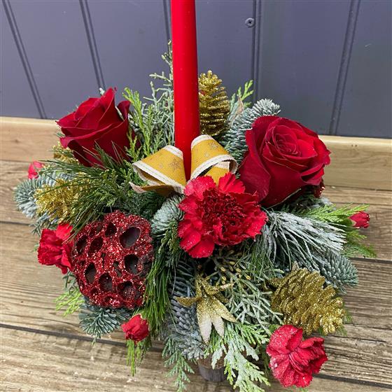 A christmassy table centre arranged in oasis with a candle, seasonal flowers and festive foliage.