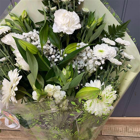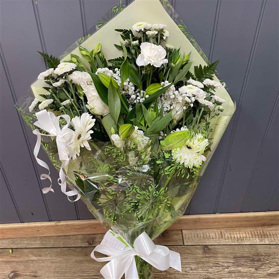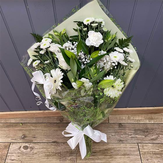 A selection of mixed white flowers, gift wrapped in cellophane with a bow. Perfect for someone that enjoys arranging g their own flowers.