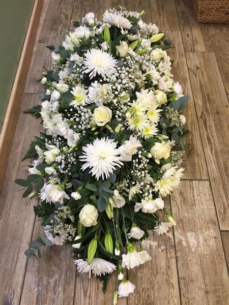 A traditional oval tribute for placement on the coffin in a selection of white and cream flowers.