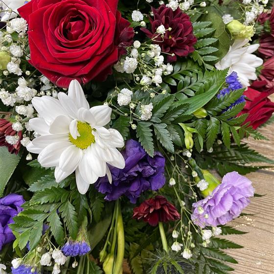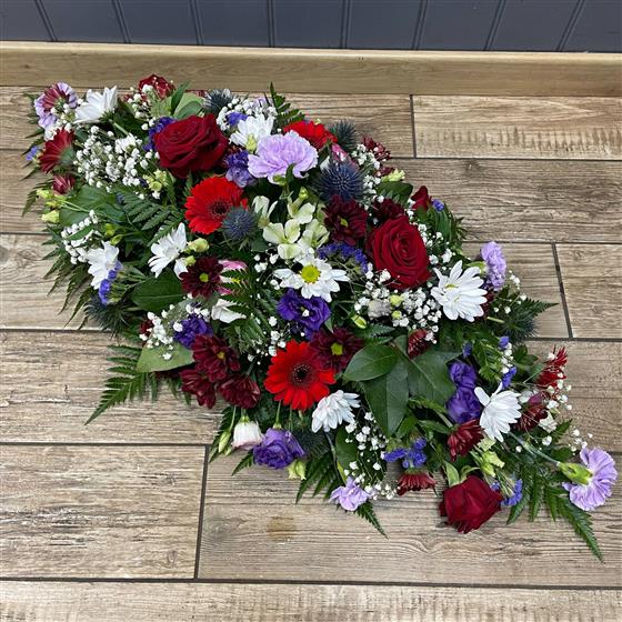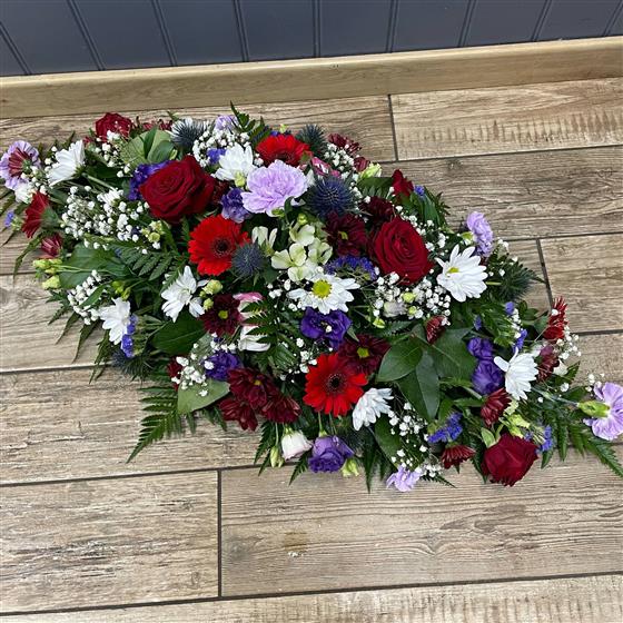An oval arrangement of mixed flowers to adorn the top of the coffin