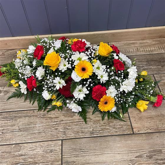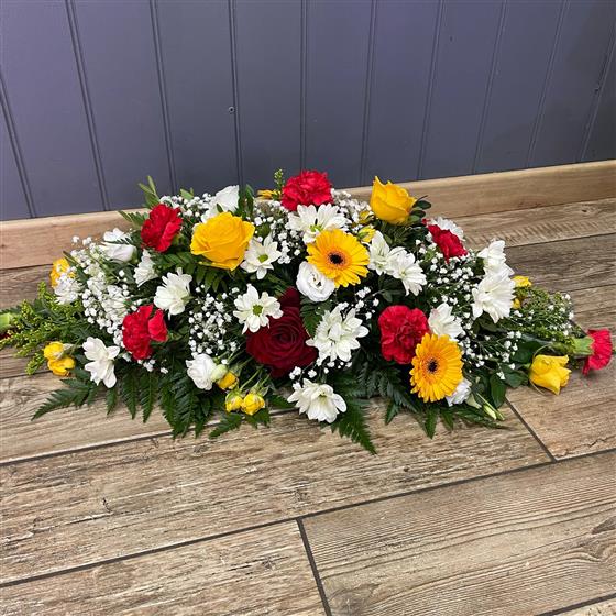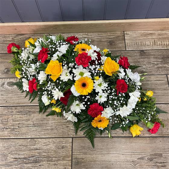 Coffin spray red white and yellow
