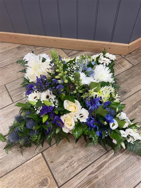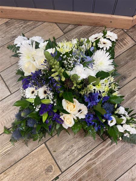 A contemporary sectioned cushion tribute seasonal mixed flowers in blue and white shades and foliage.