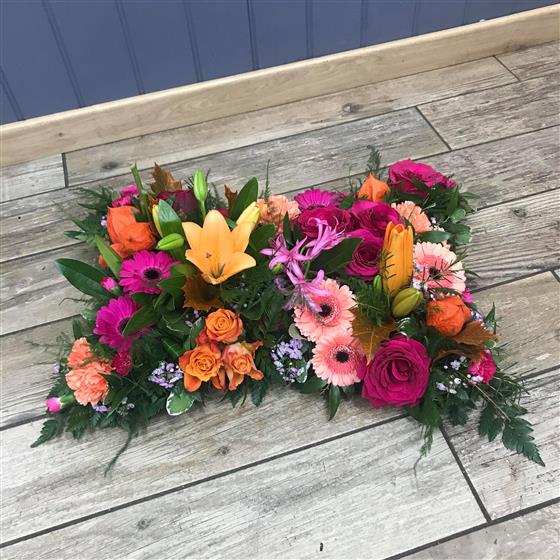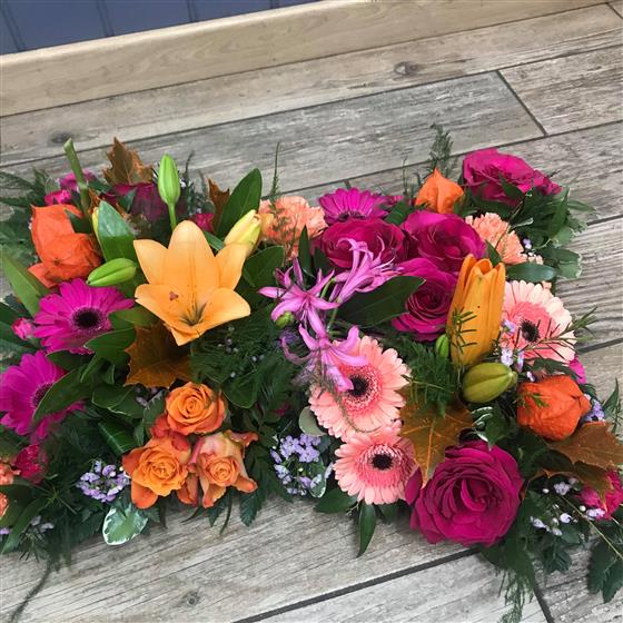 A contemporary sectioned pillow tribute in bright colours with variegated foliage.