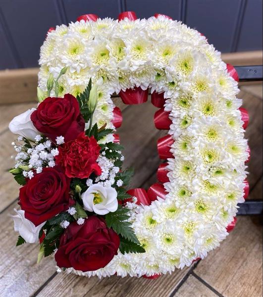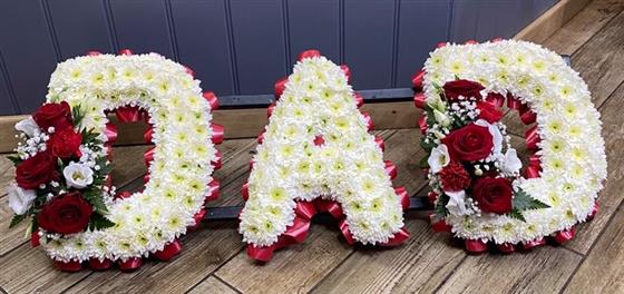 Our massed letter tributes have a white chrysanthemum base. We can personalise your word with a wide selection of coloured ribbons and coordinated posies to choose from.