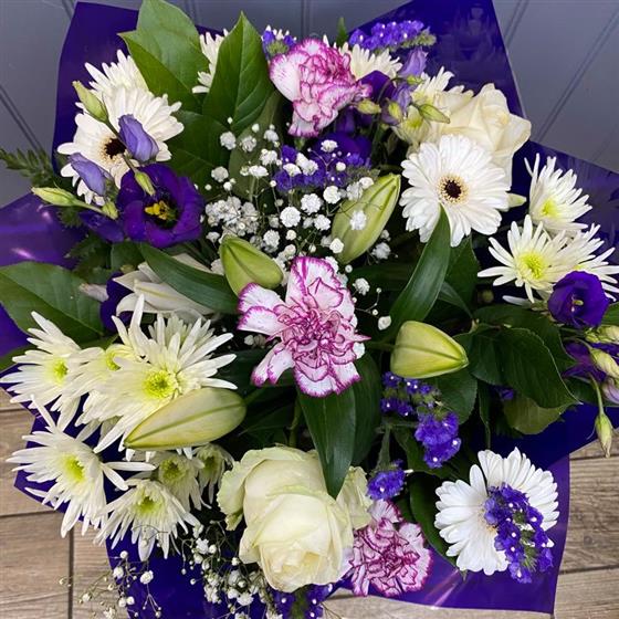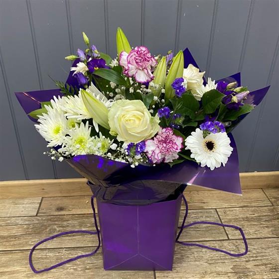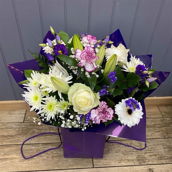 A beautiful selection of purple, lilac and white flowers hand tied in cellophane and a bubble of water.