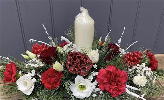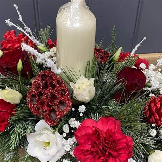 Perfect for your Christmas table, this centrepiece contains seasonal flowers and festive foliage, complete with a candle for that special gathering.