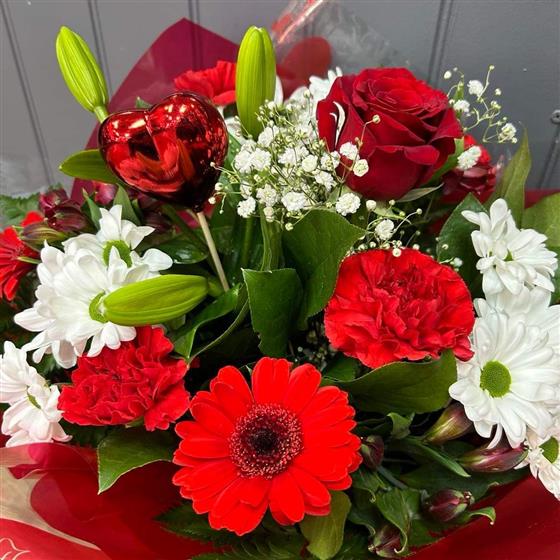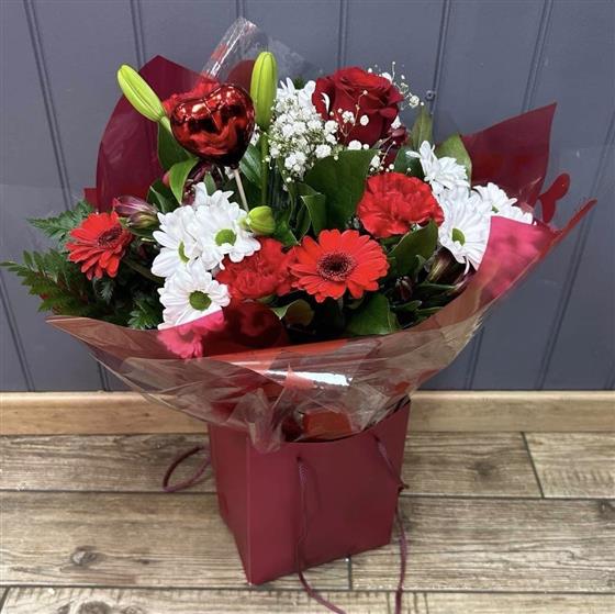 A beautiful selection of flowers including a single red rose 🌹 hand tied with a decorative heart and presented in a gift bag