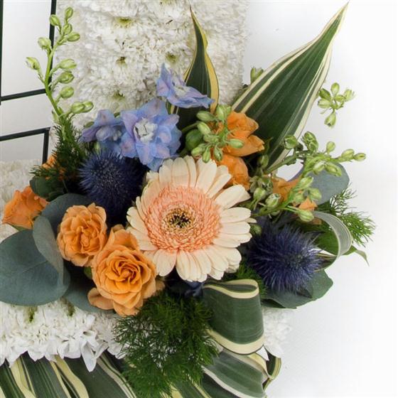 A massed tribute of white chrysanthemums with sprays available as pictured, in peaches and blues and a foliage edge, or in your choice of colour.