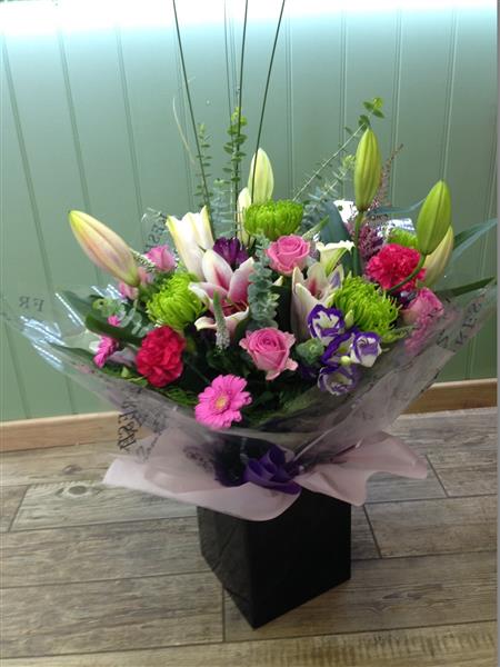 A luxury hand tied arrangement of mixed flowers presented in a deluxe gift box as the container.