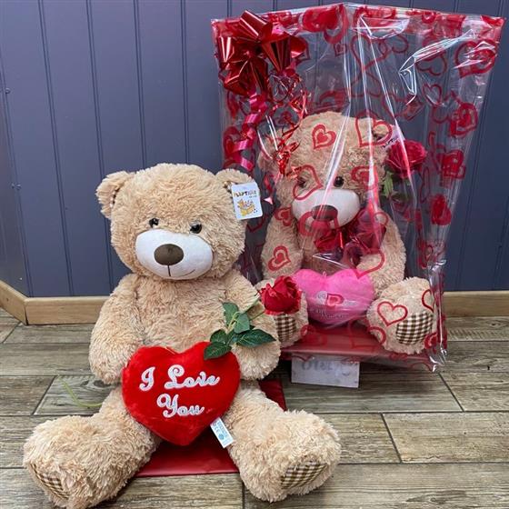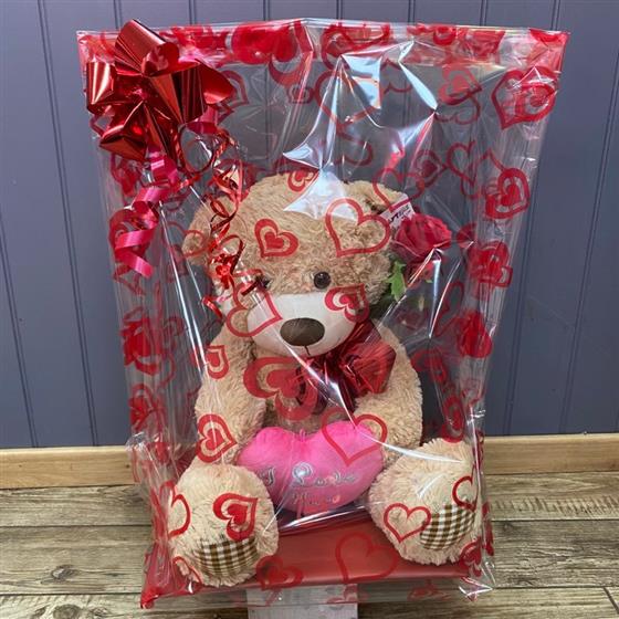 This cute, cuddly teddy bear is sitting holding an I love you heart and an artificial red rose and gift wrapped.