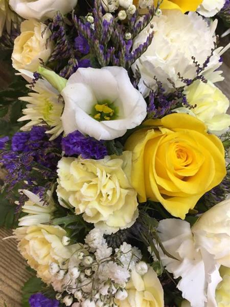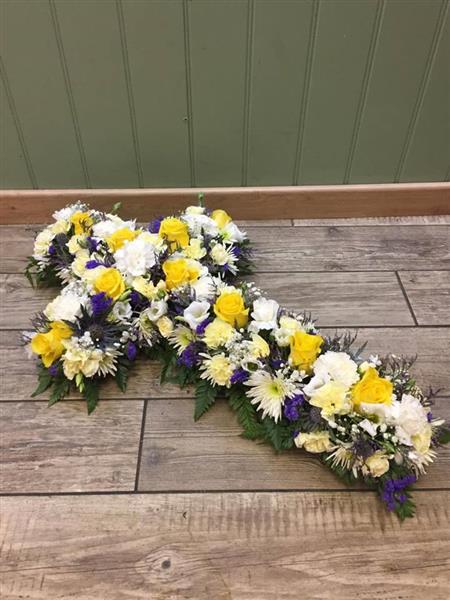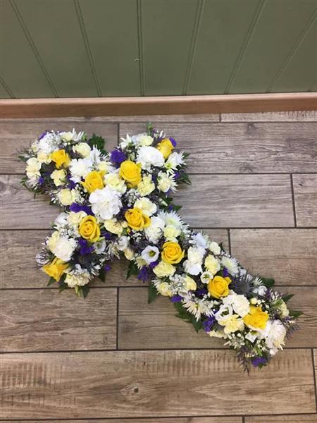 A loose cross of mixed flowers and foliage available as pictured or in a range of colours. Available with either a foliage or ribbon trim.