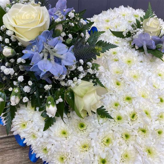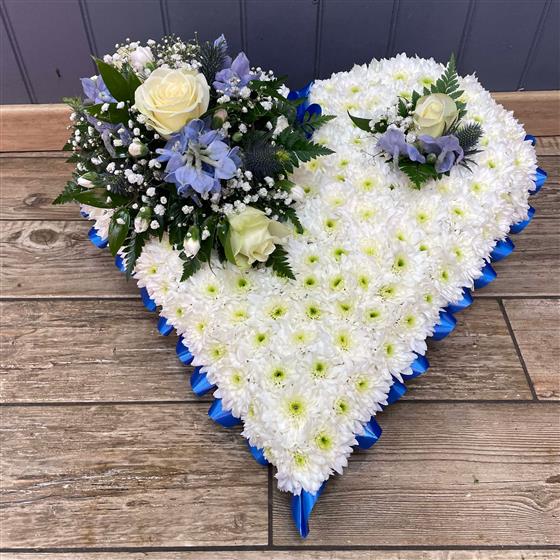 A solid heart shaped arrangement with a white chrysanthemum base, choose from a large selection of colours for the ribbon trim and posy.