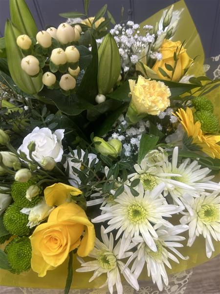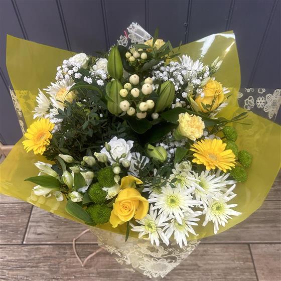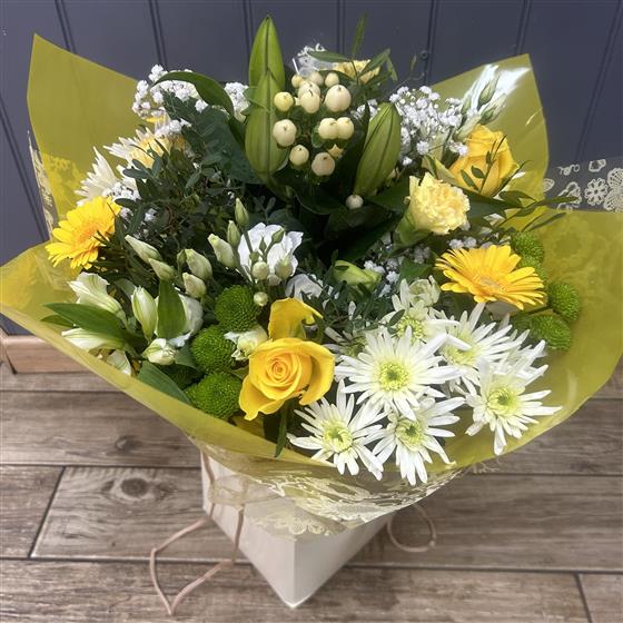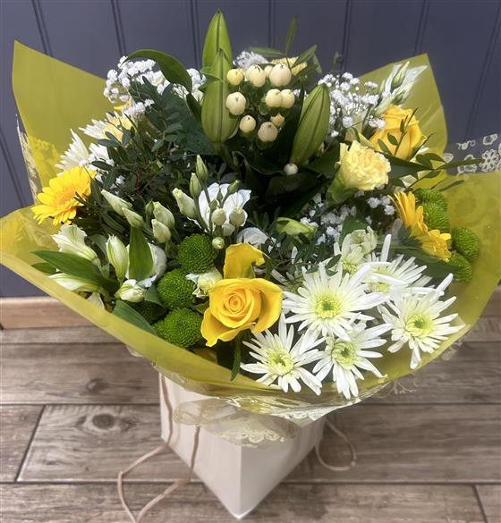 Bright yellow and cream seasonal selection Handtied into a water bubble and presented in a gift bag.