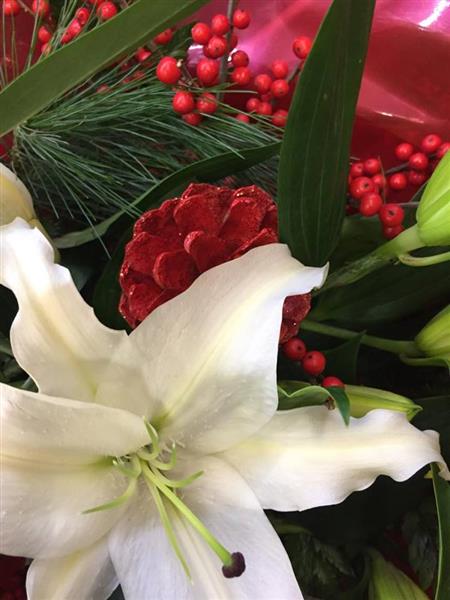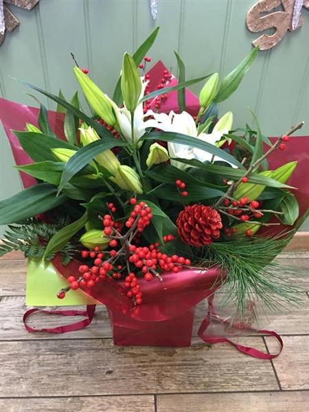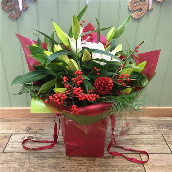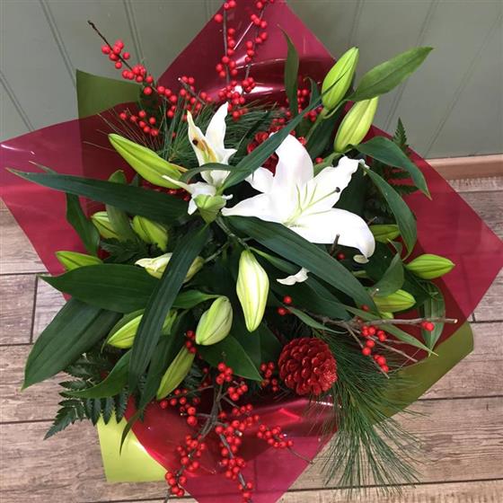 A festive hand tied arrangement in water, this classic Christmas bouquet contains seasonal foliage, white oriental lilies and berries.
