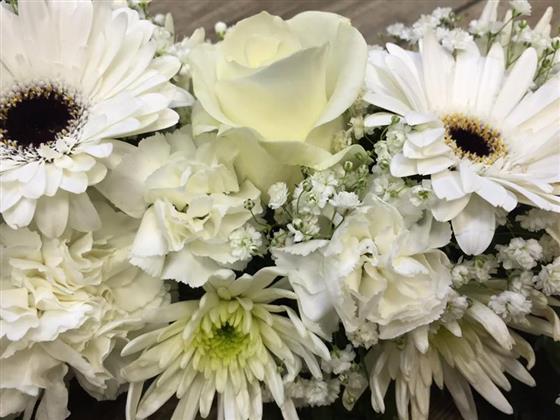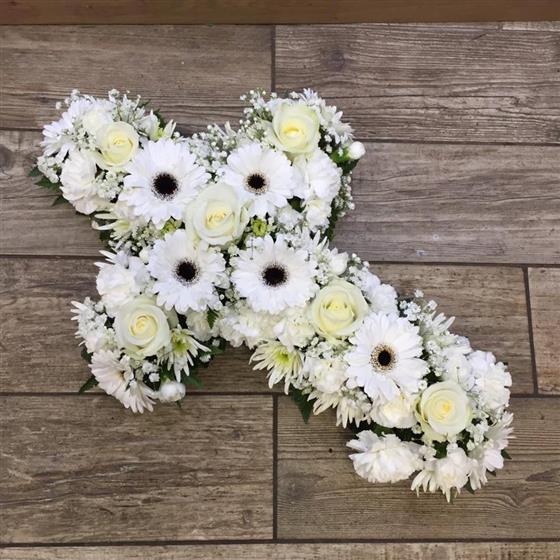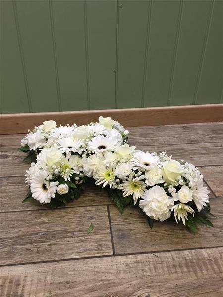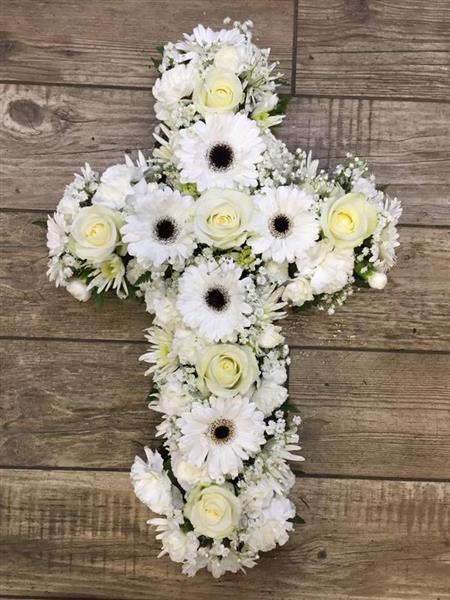 A loose cross of mixed flowers and foliage available as pictured or in a range of colours. Available with either a foliage or ribbon trim.