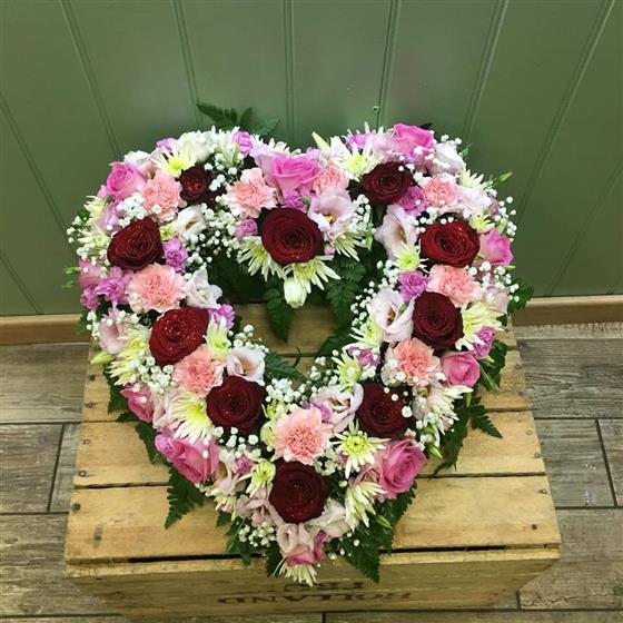 A traditional open heart shaped tribute created using a wide selection of flowers.