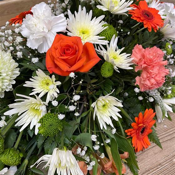 A beautiful mixed floral arrangement of bright “Irish” colours perfect for a coffin centrepiece.