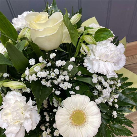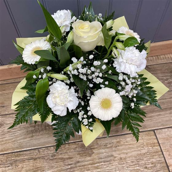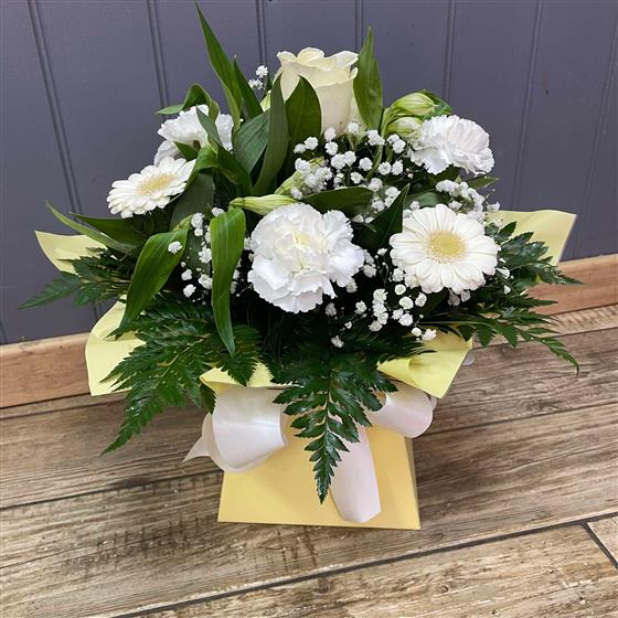 A selection of white & cream seasonal flowers arranged in oasis and presented in a gift box as the container.