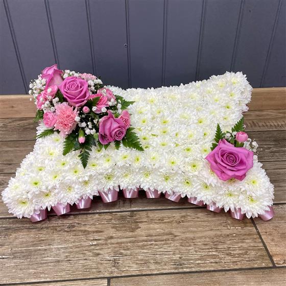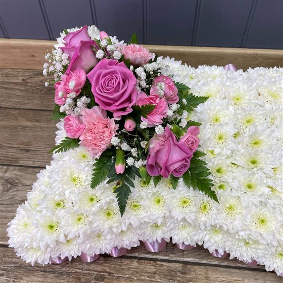 A pillow shaped arrangement with a base of white chrysanthemums choose from a selection of colours for the ribbon trim and posy.