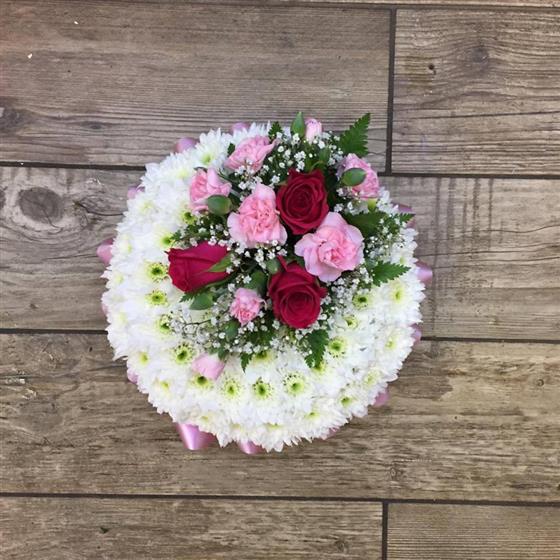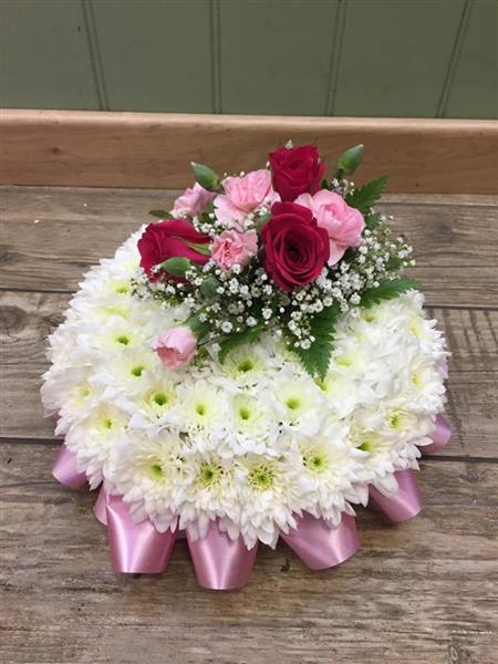 A cushion posy pad, based in white chrysanthemum with pink ribbon edge, and a red rose posy completing the arrangement.