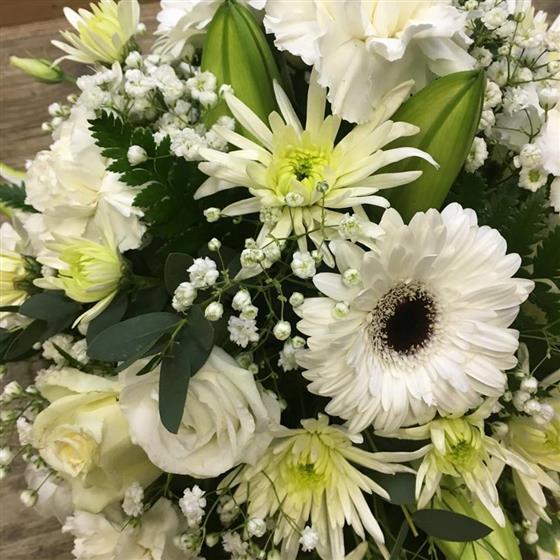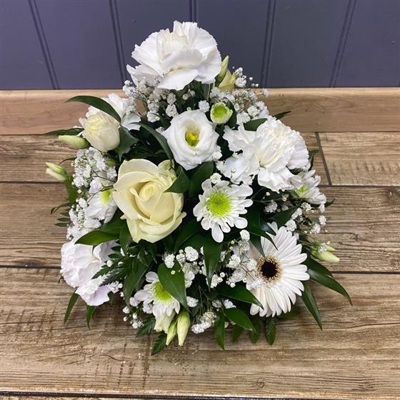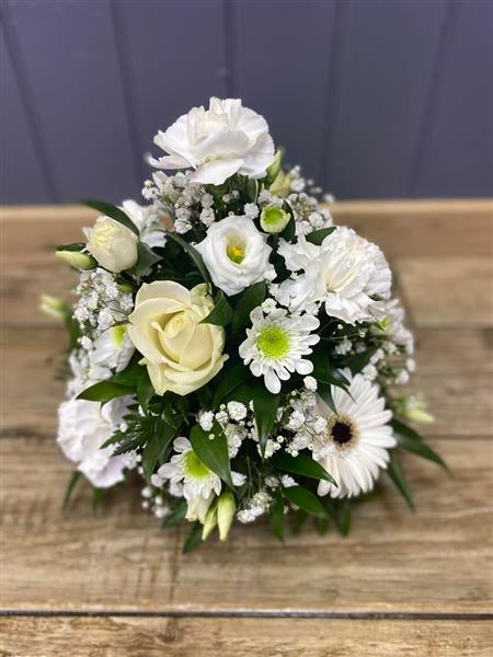 A circular arrangement of white seasonal flowers in oasis floral foam.