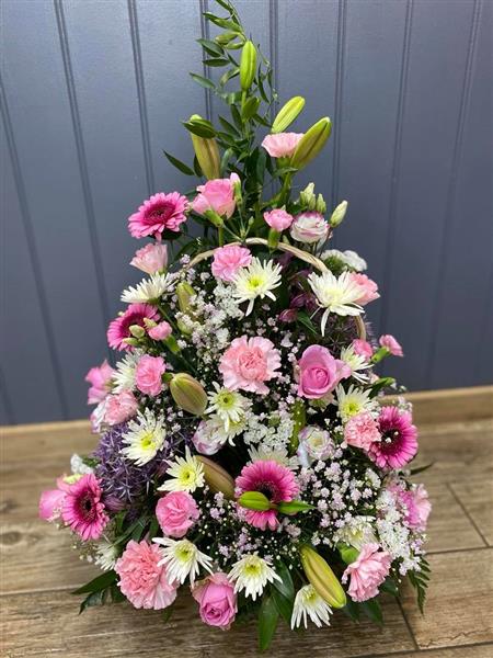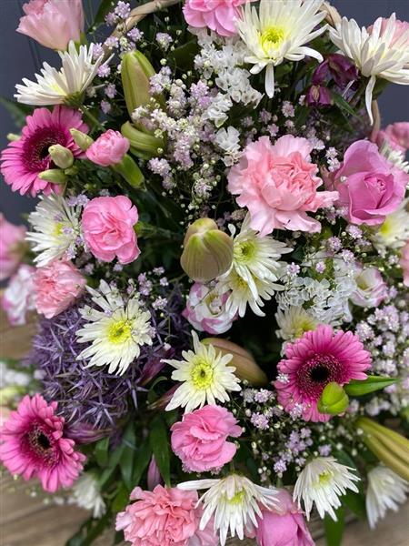 A beautiful front facing basket arrangement containing a nice selection of pink & cream mixed flowers