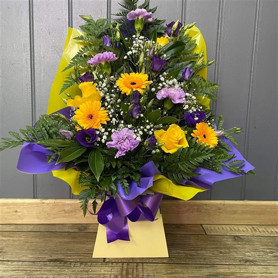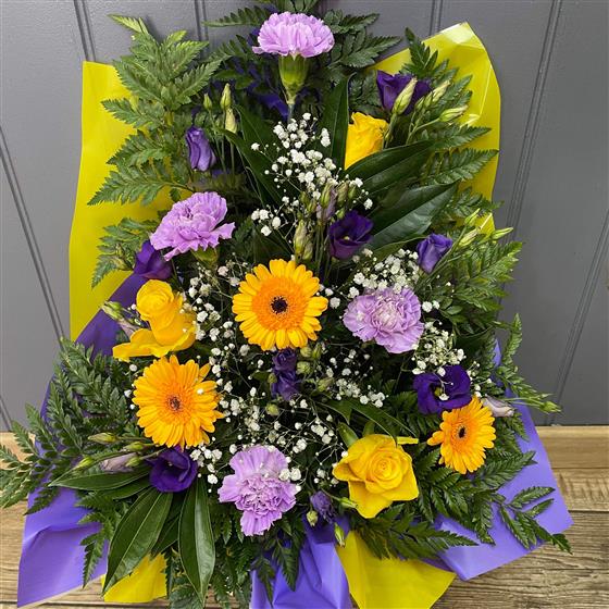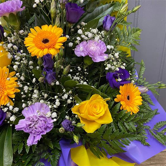 Colourful arrangement of purple, lilac and yellow mixed flowers, including roses, carnations, gerbera, lisianthus, gypsophlia and foliage.