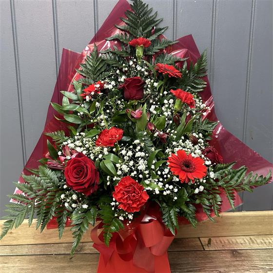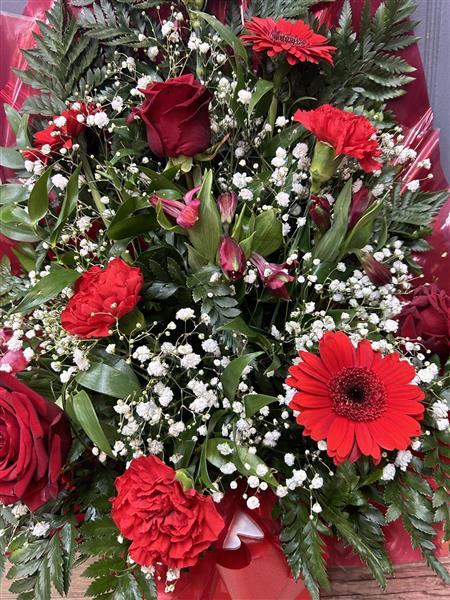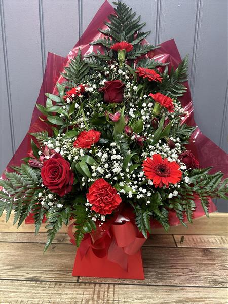 A gift box arrangement of red seasonal mixed flowers including roses, carnations, gerbera, alstromeria, gypsophlia and foliage.