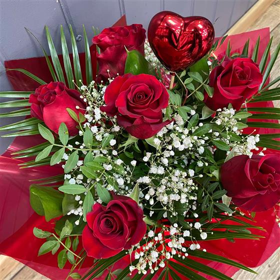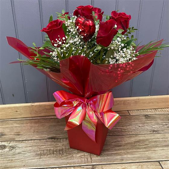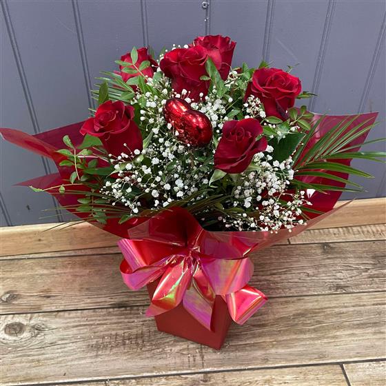 Six best red roses hand tied with gypsophila and foliage and finished with Valentine's themed gift wrapped and a decorative heart in water.