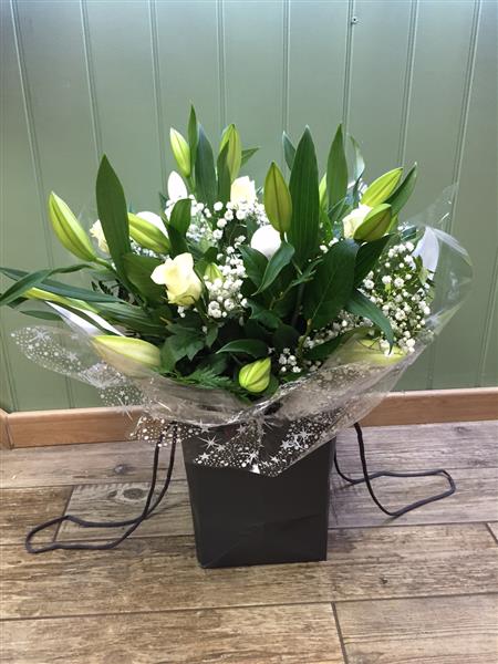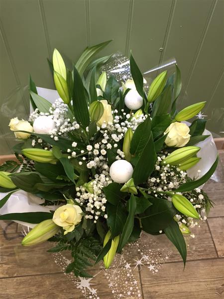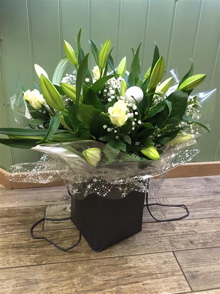 Cold and frosty white oriental lilies and roses, hand tied with festive foliage, presented in a water bubble and gift bag.