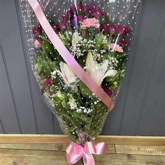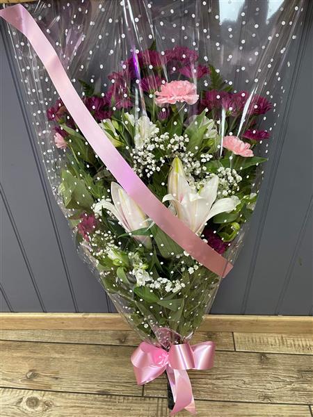 A traditional Funeral sympathy tribute, a mixed seasonal selection of pink flowers in cellophane