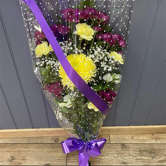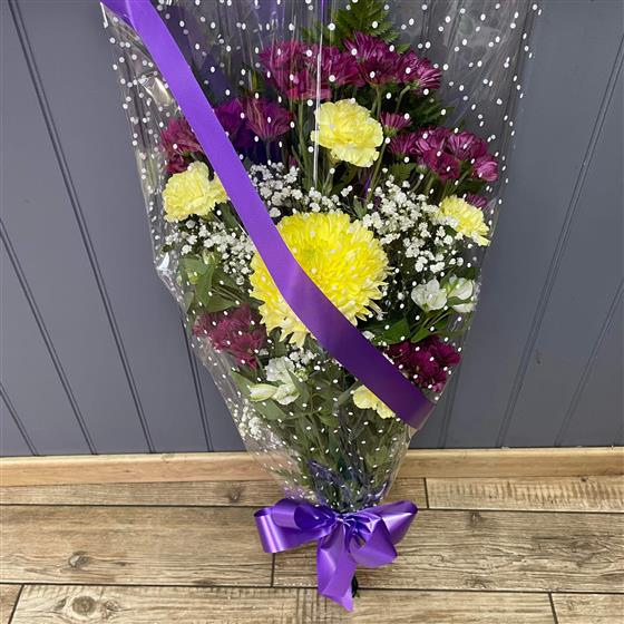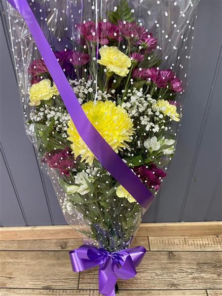 A traditional Funeral sympathy tribute, a mixed seasonal selection of purple and yellow flowers in cellophane.