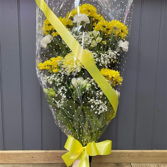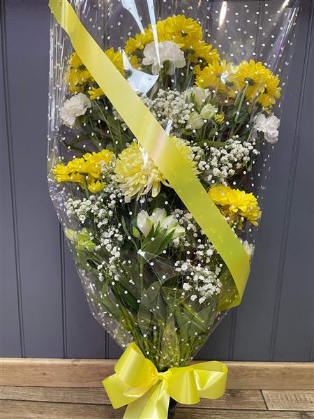 A traditional Funeral sympathy tribute, a mixed seasonal selection of yellow and white flowers in cellophane