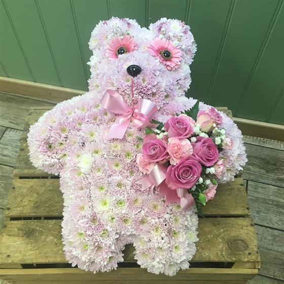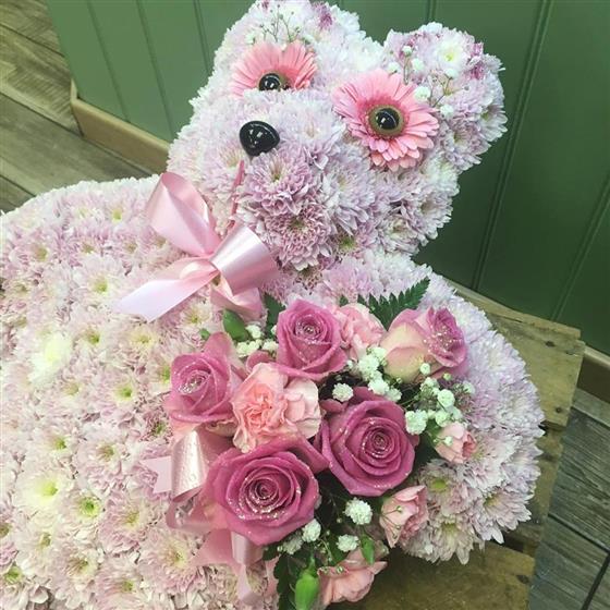 A teddy bear tribute, measuring 19" (48cm) in height, available as pictured with a chrysanthemum base and complementing sprays available in a range of colours.