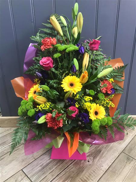A contemporary front facing arrangement of mixed flowers including lilies in tropical colours.