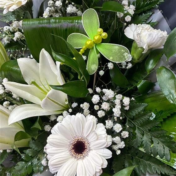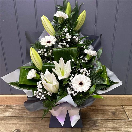 A classic gift boxed arrangement of white Lilies, carnations, gerbera, gypsophlia, foliage and a decorative dragonfly