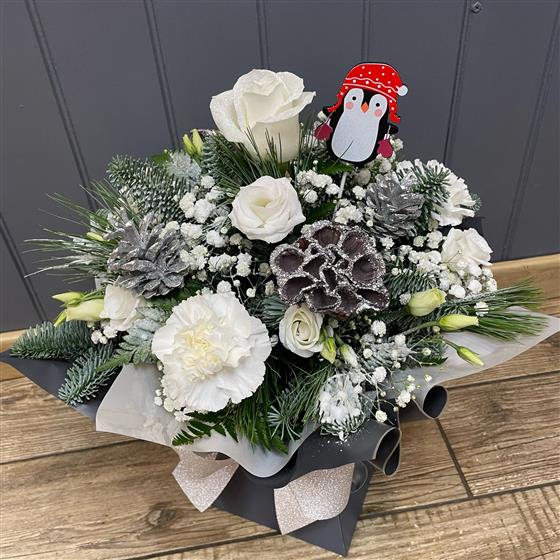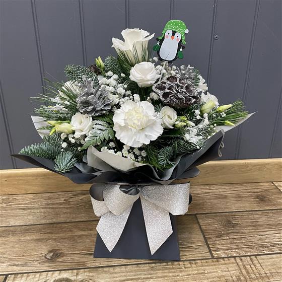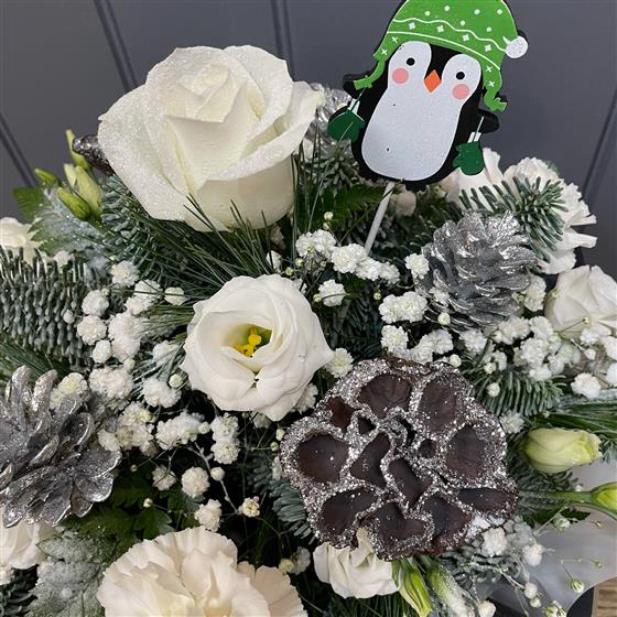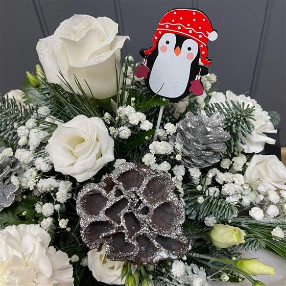 A festive arrangement of white seasonal flowers, cones and foliage arranged in oasis, presented in a gift box. Completed with a winter red or green penguin